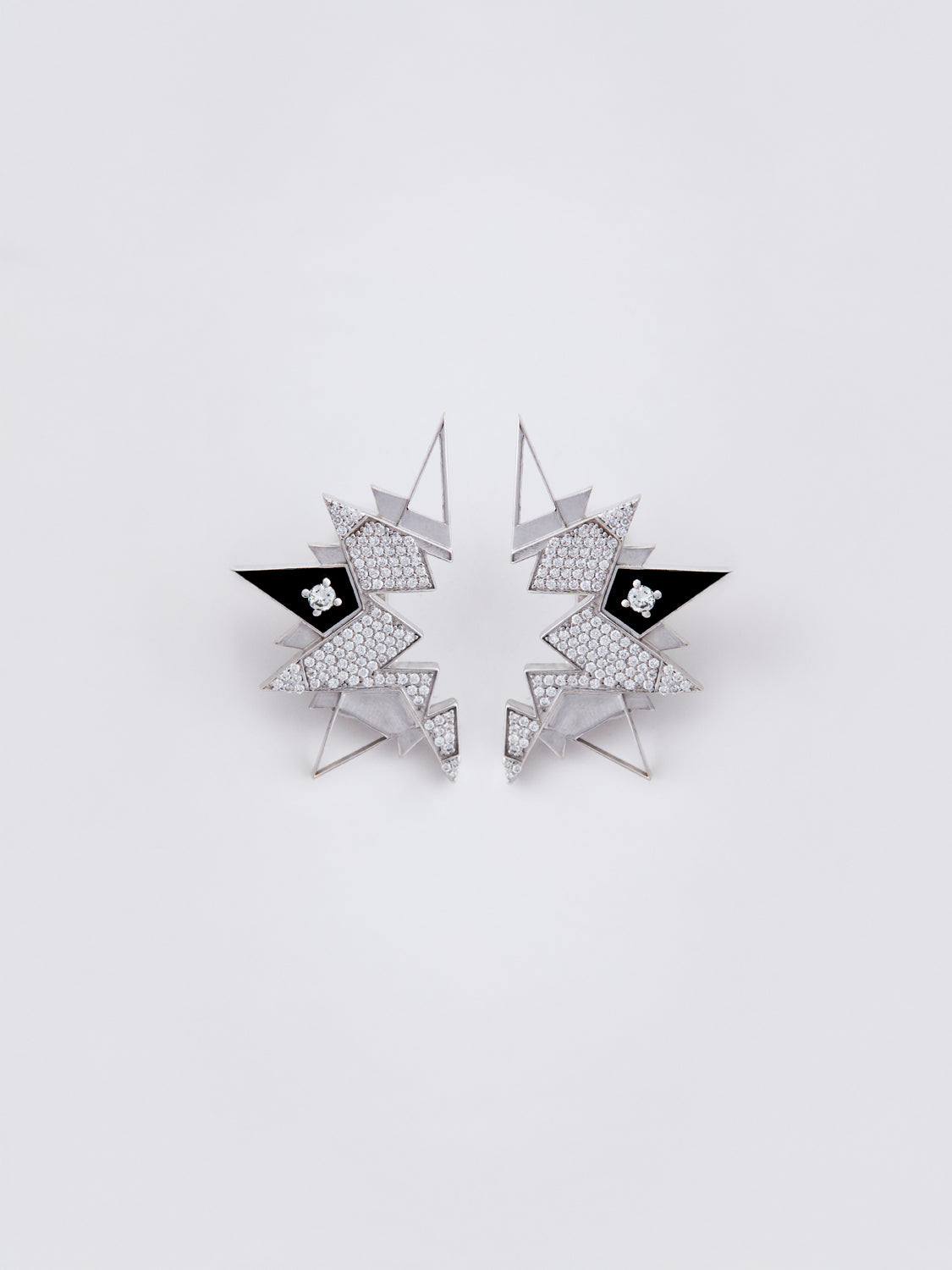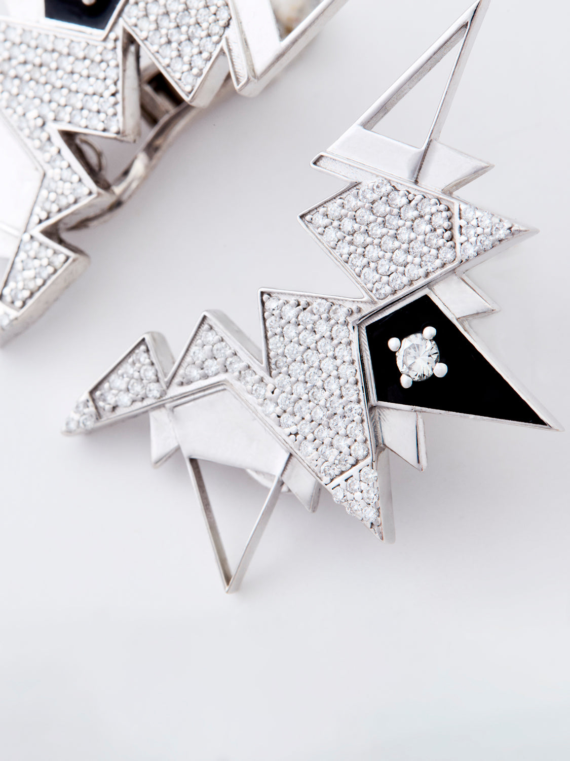 A pair of STILLE earrings, sculpted in 18 k white gold with pave setting diamond and round diamond in black enamel signing the dot.
