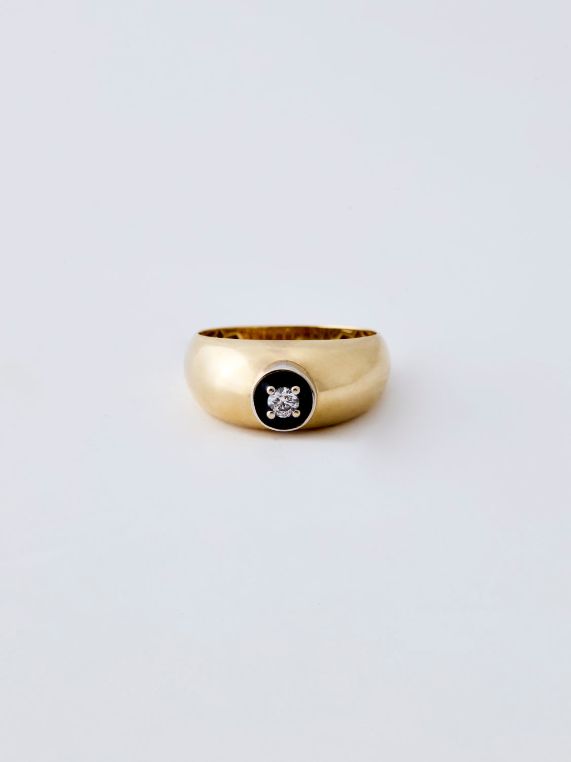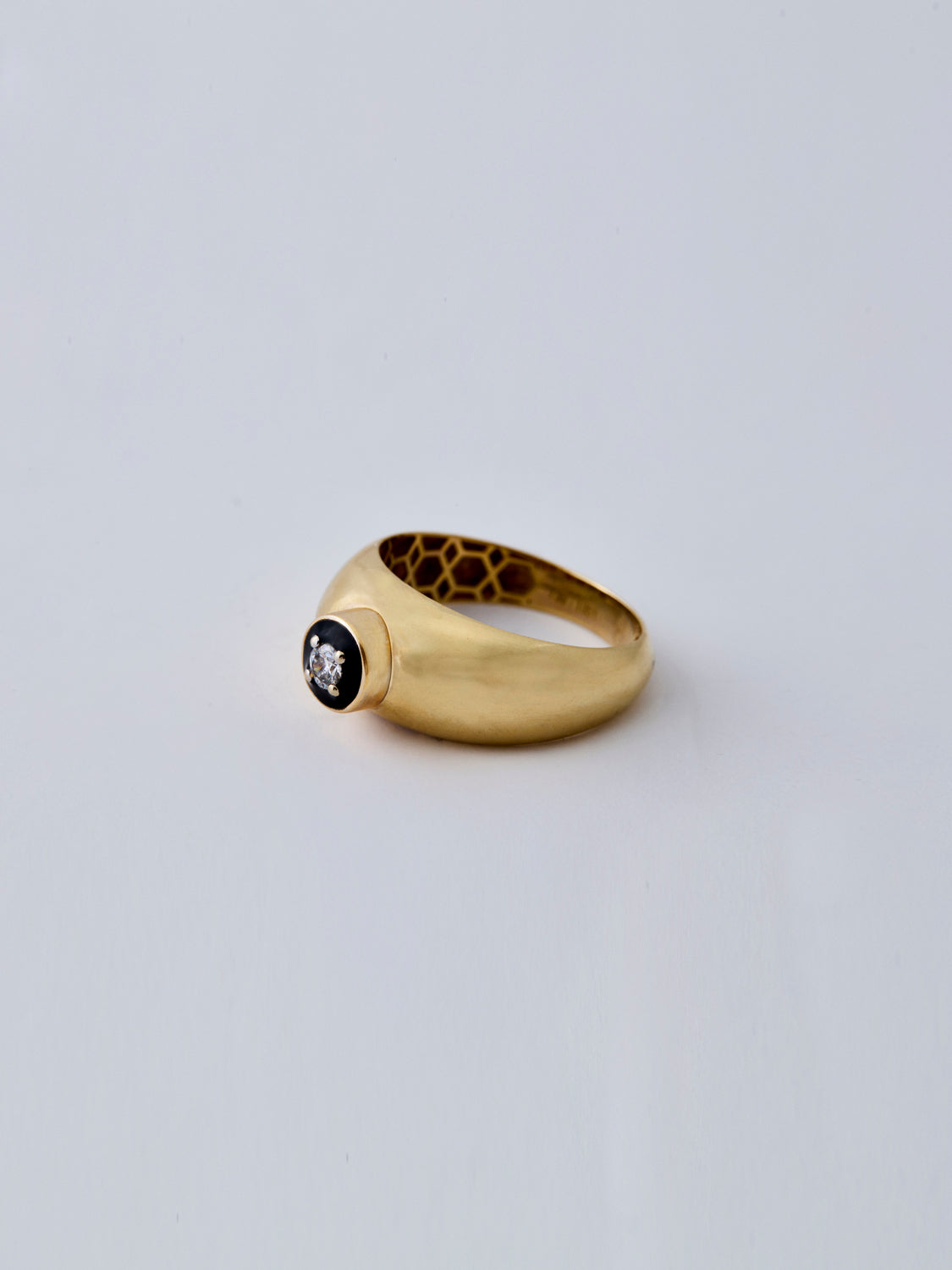 NOOR ring, crafted in 18k yellow gold with a round diamond framed in black enamel, a dot.