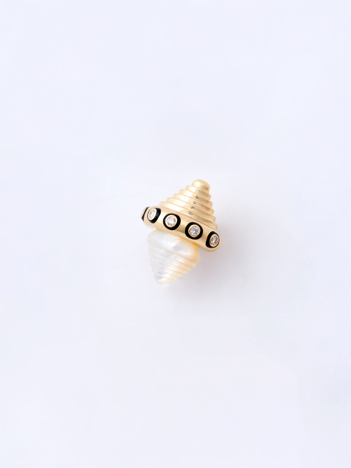 A pair of BOND earrings, formed in 18k gold, seperate round diamonds encircled with black enamel and completed by mother-of-pearl.
